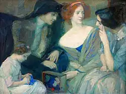 Finck's work is thematically oriented towards salon painting of the late 19th century, using impressionistic color schemes, as seen in the paintings Lute Player, Daydreaming, and Reading. She also incorporated elements of Art Nouveau, as in Worpswede Evening from 1904.
