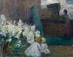 In some paintings, Finck drew inspiration from the Pre-Raphaelites, as in Angel with the Flame. From 1920 onward, she began using more vibrant colors, as seen in Flower Still Life (1924) and Little Japanese Girl (1931).[7]