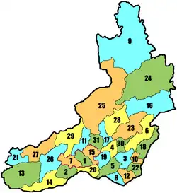 Map of Administrative divisions of Zabaykalsky Krai, with purple lines of Agin-Buryat Okrug (numbered)