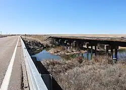 The creek rises in Lincoln County south of Karval and flows in a generally north-to-south direction. From there it receives its tributary Scott Draw.[2] Entering Kiowa County, it receives its tributaries East Fork Adobe Creek[3] and Johns Creek.[4] Throughout its course, it also receives a few unnamed tributaries, chiefly intermittent streams. After the creek passes by Arlington and under State Highway 96, it passes by the Adobe Creek Inlet Canal.[5] This canal draws water from the creek to supply the Adobe Creek Reservoir (also called Blue Lake),[6] which is named for the creek. The reservoir is an off-stream storage impoundment used for agricultural irrigation and recreation. The reservoir has an outlet canal, called the Adobe Creek Reservoir Outlet Ditch,[7] used when the reservoir overflows, that connects back to and empties into Adobe Creek. Next, the reservoir is dammed twice at the Las Animas Fish Hatchery, and its water is used to supply the hatchery with water.[8] Next, the creek is impounded by a small dam that creates Dawn Reservoir.[9] Finally, at its mouth, the creek empties into the Arkansas River in Bent County.