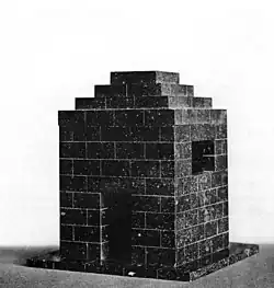 The mausoleum is shaped as a square chamber made of blocks of Swedish black granite, with blocks also forming a roof in a ziggurat. It was to be 20 feet high.[1][3] The interior was to be decorated with frescoes by Oscar Kokoschka.[3]