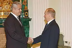Năstase was confirmed by the Parliament as prime minister on 28 December 2000, following his appointment to the position in days before by President Ion Iliescu. He held the position concurrently with his leadership of the PSD. His four years as prime minister were characterized by unprecedented political stability in post-communist Romania, continuous economic growth, and a foreign policy strongly oriented toward the West, although during 2001, the press and some of the political opposition questioned this in light of his close association with former Securitate agent Ristea Priboi.[9] Romania joined NATO, and committed Romanian troops in support of international efforts in the Balkans, Afghanistan, and Iraq.