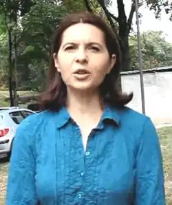 From 2007 to 2008, Săftoiu headed Capital Promotion, a Bucharest consulting firm.[4] In a February 2008 interview, she remarked that Băsescu, whom she accused of creating a Messiah image for himself, and Udrea, whom she described as "dreaded but not respected", rule the PDL (into which the PD had by then evolved) by fear.[12] That summer, she joined the PNL, running for a seat in Prahova County, considered the fiefdom of one of Băsescu's most trenchant opponents, businessman Dinu Patriciu.[13] She won her race at that autumn's election, after which the PNL moved into opposition.[14] In the Chamber, she sat on the committee for education, science, youth and sport, and was a deputy leader of the PNL group from 2010.[15] In February 2012, against a backdrop of anti-government protests and calls for early elections, Săftoiu resigned her seat.[16][17] That December, Săftoiu's local PNL chapter removed her from the party without informing her in advance, prompting her to comment that the process was harsher than purges during Romanian Communist Party rule, when one could "at least... say something in one's own defense".[18] In April 2013, Săftoiu became spokeswoman for the PD-L at the invitation of party leader Vasile Blaga, a move seen as a rebuke to Băsescu, who had earlier distanced himself from the party.[19] In May 2015, she published a controversial memoir, Cronică de Cotroceni ("Cotroceni Chronicle"), recounting her years as Băsescu's adviser. Among the book's claims is that Băsescu and Udrea carried on an extramarital affair in the former's office at Cotroceni Palace; the two promptly denied the existence of such a liaison.[20]