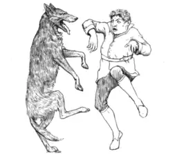 ![]() Gilla Na Chreck An Gour (The Fellow in the Goatskin) meets a man on the road. Illustration by Willy Pogány (1916). | |