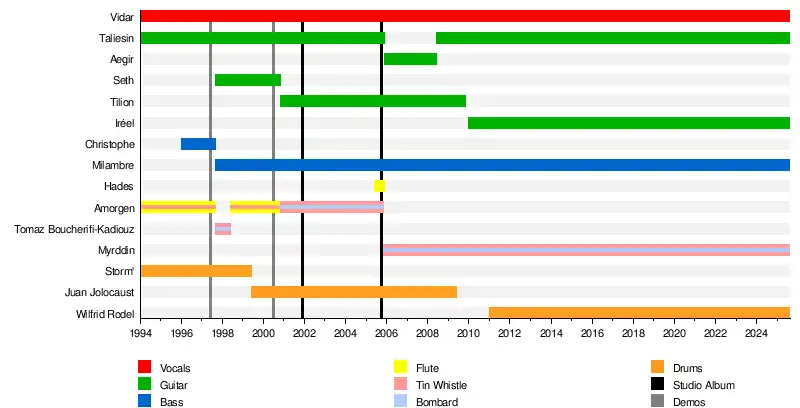 Aes Dana was formed in 1994, with Taliesin (guitar) and Amorgen (Irish flute), soon joined by Vidar (vocals), Storm (drums), and Christophe (bass). In 1997 and 1999, Christophe was replaced by Milambre, and Storm by Juan Jolocaust, and Seth join Taliesin as second guitarist.