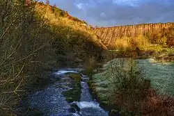 A large part of the upper catchment of the river is inundated by the Clywedog reservoir which stores water from the catchment, especially during the winter months, and releases it during periods of low flow to support the flow in the Severn so that drinking water may be abstracted downstream.[2] The management rules also enable the reservoir to maintain the reservoir below maximum level during the winter so that there is capacity to absorb flood flows to reduce the impact of flooding further down the main river.[3] The Afon Clywedog thus has a highly regulated flow with relatively high flow in dry conditions and reduced flow in wetter weather.