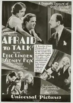 Afraid to Talk is a 1932 American pre-Code drama film directed by Edward L. Cahn and written by Tom Reed. The film stars Eric Linden, Sidney Fox, Tully Marshall, Louis Calhern, George Meeker and Robert Warwick. The film was released on December 1, 1932, by Universal Pictures.[1][2][3]