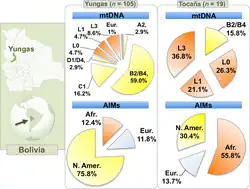 MtDNA haplogroups and continental ancestry based on AIMs. Samples are from Yungas (left) and Tocaña (right).
