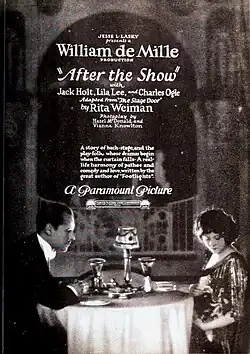 After the Show is a 1921 American silent drama film directed by William C. deMille and written by Vianna Knowlton and Hazel Christie MacDonald based on a story by Rita Weiman.[1] The film stars Jack Holt, Lila Lee, Charles Stanton Ogle, Eve Southern, Shannon Day, and Carlton S. King. The film was released on October 9, 1921, by Paramount Pictures.[2][3] It is not known whether the film currently survives,[2] and it may be a lost film.