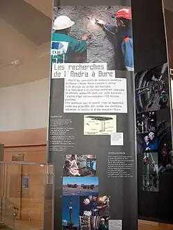 In 1999, ANDRA was charged by the State with creating an underground laboratory in the commune of Bure, Meuse for the study of radioactive waste storage, and to operate it until 2006.[14] The project consists of testing deep geological storage (at a depth of 500 m in a layer of clay), of the most dangerous wastes. The aim of deep geological storage is to contain the wastes until they become non-hazardous, over a period of 100000 years. ANDRA has been progressively buying land for the site, and has created a public information centre at Saudron, to inform the public on the principles of geological disposal. As of August 2015, 1650 m of tunnels had been constructed.[15]