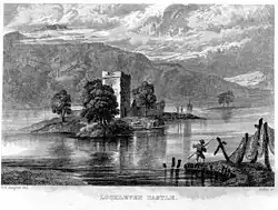 In June 1567, Queen Mary was imprisoned in Sir William's castle of Lochleven.[7] Agnes became the Queen's chief female companion during her ten and a half months of imprisonment, accompanying her throughout the day and often sleeping in her bedchamber.[8][9] It was following the birth of Agnes's child when she was recovering from her pregnancy, thus providing Queen Mary with greater liberty, that Mary chose to escape from Lochleven with the aid of Sir William's brother George and a young orphaned cousin named William Douglas who also lived at the castle and may or may not have been the earl's illegitimate son. When Sir William learned of his royal captive's escape, he was so distressed that he attempted to stab himself with his own dagger.[10]