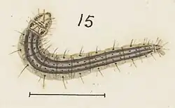 The larva is about 1⁄2 inch in length, rather stout, tapering at each end. The head is brown with three broad darker brown bands; the second segment is pale brown and horny; the rest of the body creamy white with three dark brown dorsal stripe; each segment has eight dark brownish or black warts generally surmounted by a fine yellowish bristle.[6]