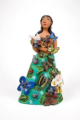 Born in 1943, Guillermina Aguilar Alcántara is the first-born daughter of Isaura Alcántara Díaz and Jesús Aguilar Revilla.[2] At an early age, she would help her mother with household chores and received no formal education.[2] Guillermina started her artistic practice through the modeling of animal figures and would later expand her craft to reflect her surroundings and cultural customs with events such as weddings, wakes, and baptisms, to name a few.[3] Additionally, Guillermina's work often depicts female figures in their traditional Oaxacan dress with expressive facial features as well as elements of nature.