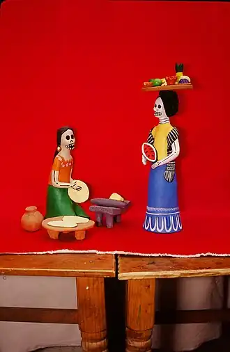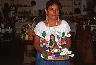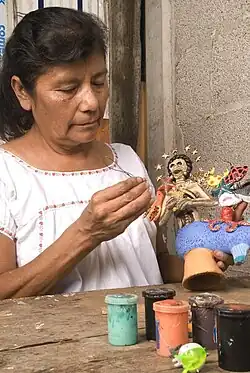 The Aguilar family are clay-making artisans from Ocotlán de Morelos, a rural town in the state of Oaxaca, Mexico. The town's clay production included only utilitarian items until Isaura Alcántara Díaz and her husband, Jesús Aguilar Revilla, expanded their wares into decorative figures and religious items.[1] The couple passed their craft down to their daughters Guillermina, Josefina, Irene, and Concepción, who have continued to innovate their own styles and techniques around subject matters related to the life and traditions in Oaxaca as well as iconic Mexican figures. The family craft and artistic recognition lives on through the children and grandchildren of these four women.