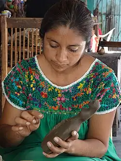 Leticia García Aguilar was born in 1978 and is the only girl of nine children born to Josefina Aguilar Alcántara. She started working with clay as a young girl, intrigued from watching her mother work.[2] Leticia's art is known to have a notable use of color as well as expressive faces in her figures. She draws inspiration from nature, myths, her indigenous culture, and the many facets of womanhood. In developing her practice, Leticia has learned to let the artistic process flow naturally and to not let an idea restrict her creative journey.[2]