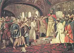 Due to Ivan III's refusal to pay tribute since the start of his reign in 1462, Ahmed Khan launched several expeditions to Russia in an attempt to force the grand prince of Moscow to recognize his suzerainty.[3] Ivan III also began the process of unifying the Russian principalities, which would strengthen Moscow's position against the Horde and Lithuania.[3] In 1479, Ahmed Khan sent his tax collectors to Moscow, but Ivan III again refused to pay.[3] As a result, Ahmed Khan began preparing for a military confrontation and coordinated his campaign with the Polish–Lithuanian ruler.[4]