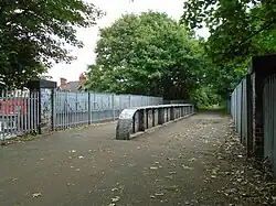2. ^ Not all of the platform was filled-in for all of the time. Most of the bibliographic sources use a 1912/1913 photograph sourced from the National Railway Museum taken to the east of the road bridge that shows the platform with the cinders levelling off at rail height to make the platform, with the platform being slightly raised from the running line. A later photograph taken from further west in 1933 shows a train with passengers disembarking but with no cinder infill. [7][8][9]