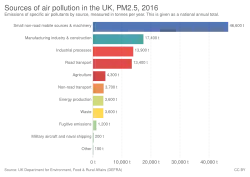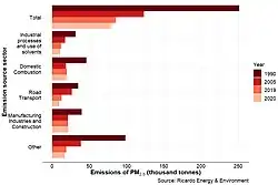 In the United Kingdom domestic combustion is the largest single source of PM2.5 and PM10 annually, with domestic wood burning in both closed stoves and open fires responsible for 38% of PM2.5 in 2019.[88][89][90]