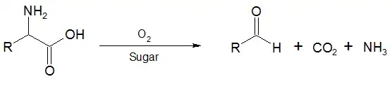 In the first reaction, an α-amino acid is oxidised and undergoes decarboxylation to give an aldehyde at the former α position by heating with oxygen in the presence of a reducing sugar.[1][2][3] This reaction is useful for preparing dichlorophthalimido derivatives of peptides for mass spectral analysis.[4]