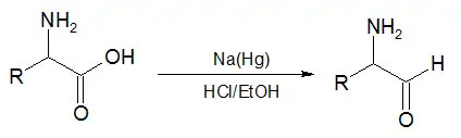 In the second reaction, an α-amino acid, or an ester of it, is reduced by sodium amalgam and ethanolic HCl to give an α-amino aldehyde.[5][6] This process is conceptually similar to the Bouveault–Blanc reduction[7][8][9] except that it stops at the aldehyde stage rather than reducing the ester all the way to two alcohols.