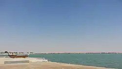 Al Khor overlooks a sheltered bay upon which Al Khor Island (also known as Purple Island and Jazirat Bin Ghanim) lies. The width of the bay ranges from 2.2 to 6.5 km (1.4 to 4.0 mi). It is linked to the open sea by a channel with a width of roughly 750 meters (2,460 ft) on its southern end.[27] The area is home to extensive stands of mangroves, which cover an area of about 168 hectares off the coast.[28]