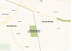 The reserve is located in eastern Dubai, occupying an area of 15.06 km2 along the border with the Al Bataeh municipality of the Emirate of Sharjah.[4][5]