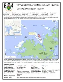 As a result of Heisey's contributions as a writer and as a long time resident in the Township of Georgian Bay the Ontario Minister of Natural Resources officially named a group of islands in the Township of Georgian Bay located to the northwest of Beausoleil Island near Honey Harbour, on the Georgian Bay after him on July 17, 2017, pursuant to Section 4 of the Ontario Geographic Names Board Act, R.S.O. 1990, c. O.16.[84]