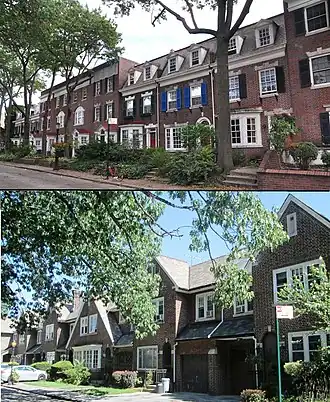 The Albemarle–Kenmore Terraces Historic District is a small historic district located in the Flatbush neighborhood of Brooklyn, New York City. It consists of two short cul-de-sacs, Albemarle Terrace and Kenmore Terrace, off of East 21st Street, and the 32 houses on the two streets,[4] as well as a four-family apartment building at the end of Albemarle Terrace. The New York City Landmarks Preservation Commission, which designated the district as a landmark in 1978, noted that the "terraces are distinguished by the uniform use of materials, height and color producing a harmonious effect".[5]
