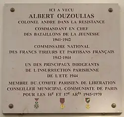 Commemorative plaque at Ouzoulias's home at 9 rue du Général-Niox, Paris 16