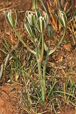 | The flowers of Albuca setosa are held erect, and the tepals have thick dark central lines | |