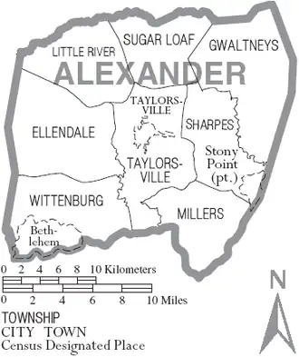 By the requirements of the North Carolina Constitution of 1868, counties were divided into non-functioning county subdivisions called townships. There are eight townships in Alexander County:[20][21]