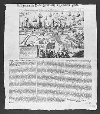 He moved his company to Stralsund where they joined other Scots of Donald Mackay's regiment during the Battle of Stralsund (1628),[3] where he served as lieutenant colonel. He succeeded the Danish-German mercenary Heinrich Holk as Stralsund's governor.[4] During the time he was in command, the town withstood the siege of Albrecht von Wallenstein's imperial army.[4] He was succeeded as the governor in July by Alexander Leslie, a Scot in Swedish service who arrived with a contingent of Scots, Swedes and Germans.[5] Wallenstein lifted the siege on 4 August,[6] forced to accept his first check in the Thirty Years' War.[7]