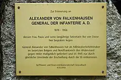 In 1950, Falkenhausen became a widower; in 1960 he married his second wife, Cécile Vent (1906–1977), who had been a Belgian resistance fighter.[19] He had met her during his imprisonment in 1948, when Vent was a member of the administrative commission of the prisons of Verviers.[20]