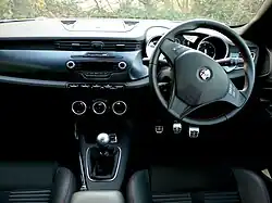 The Quadrifoglio Verde is the top of the range model with a 1.75 L (1,742 cc) turbocharged TBi engine rated at 235 PS (173 kW; 232 hp), a lowered ride height (15 mm (0.6 in) at the front and 10 mm (0.4 in) at the rear), 18-inch alloy wheels and 225/40 R18 tires, an enhanced braking system (330 mm (13.0 in) front, 278 mm (10.9 in) rear) with calipers painted Alfa red; dark tinted windows, aluminium pedals, cloverleaf badges, leather and microfibre seats plus sports leather seats as an option; dark brushed aluminium dashboard.[18][19] 1750 is an engine size which has its roots in Alfa Romeo's history, with 1.75 L engines being used to power some of Alfa Romeo's first cars.[20]