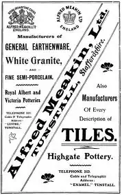 - ^ "Alfred Meakin (Tunstall) (Ltd)". www.thepotteries.org. Retrieved 2023-11-06.