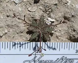 It is a small herb producing a thin, branching stem up to about 23 centimeters tall. It is coated in glandular hairs. Several deeply lobed leaves 1 to 6 centimeters long are located in a basal rosette at ground level around the stem. There are smaller, unlobed leaves along the stem. The inflorescence produces one to three flowers, each about half a centimeter wide with a thread-thin tube. The corolla is purple-stained white, the throat is yellowish, and the tube is purple.