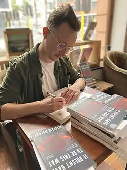 Alistair Mackay signing copies of his debut novel, It Doesn't Have to Be This Way (Kwela, 2022), at the Book Lounge, an independent bookstore in Cape Town, South Africa (19 February 2022).
