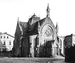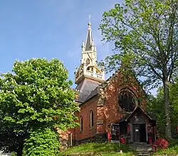 In the 19th century, a large number of English and American artists, students[2] and business people lived in the cultural and trade fair city of Leipzig. As a result, the first or regular Anglican services were held for the Anglo-American community as early as 1862/64.[3] Initially, the Lutheran St. Thomas Church and the University of Music and Theatre were used for this purpose.[4] To remedy this, the Saxon architect Oskar Mothes was commissioned to plan the construction of the church in 1870. His designs for the building project were used for the Anglican St. Luke's Church[5] in the bohemian town of Karlovy Vary, which was built between 1876 and 1877 (as a kind of "twin sister"), which may have delayed the start of construction in Leipzig. The consecration of the church in Bohemia took place on 24 June 1877.