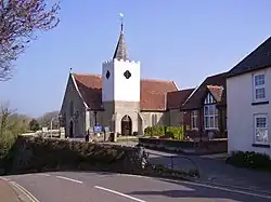 All Saints' Church is located at the north end of the village of Newchurch. On the west side of the church, the road has a steep descent which gives the impression that the church is on a bluff.[2] The geographic setting has been described by Venables, a poet as: "To the north the gazes embraces the whole of the vale of Newchurch with the undulating ridge of the chalks down beyond, ending towards the valley of the Medina in the abrupt Slope of the St.George’s Down. The white cliffs of Culver…"[5]