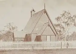 Reverend William Gore had visited Yandilla from time to time and conducted services during his visits. In 1860 he bought into the family firm and eventually became the major shareholder. The "village" at the station by then had over 100 inhabitants and a new church was built close to the homestead in 1863. It was described in the Darling Downs Gazette as:[1]