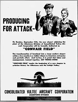 In mid-December 1942, during World War II, Allentown, Pennsylvania, was the site for the production of the TBY-2 Sea Wolf torpedo bomber used by U.S. Navy. The bomber was manufactured at Mack Trucks' Plant 5C. Consolidated Vultee built present-day Allentown Queen City Municipal Airport, which included an office building, hangar, the airport, and a highway that linked the plant to the new airport complex.
