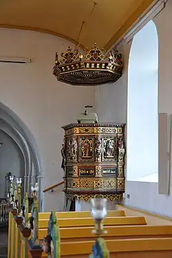 The altarpiece is from 1590. It features the coats of arms of Denmark and Mecklenburg. The latter is a reference to Sophia of Mecklenburg. The pulpit was created by Albert Schrøder's workshop in 1710.[2]