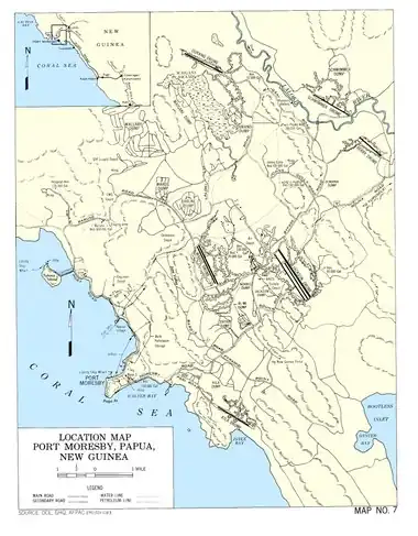 The airfields in the Port Moresby area were initially known by their approximate distance from Port Moresby. In April 1942, there were only two operational airfields: Seven Mile Drome, an airfield developed by the RAAF with a single 1,524-by-23-metre (5,000 by 75 ft) runway, and Three Mile Drome (also known as Kila Airfield), a pre-war civilian airfield. Work had commenced on two more: Fourteen Mile, also known as Laloki, and Five Mile, which had originally been developed as an emergency landing strip. Four more were subsequently developed: Twelve Mile, Fourteen Mile, Seventeen Mile and Thirty Mile.[6]
