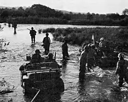 The logistics plan provided for delivery of five days' supply of petrol, oil and lubricants (POL) and subsistence every three days, thus building up reserves by two days every three. The troops would land with five units of fire of ammunition.[30] A unit of fire was a somewhat arbitrary measurement for accounting purposes, and was different for each type of ammunition.[31] It was 60 rounds for the M1 carbine, 150 for the M1 Garand rifle, 750 for the M1918 Browning Automatic Rifle (BAR) and 900 for the M1919 Browning machine gun.[32] Each day five units of fire would arrive with the troops landing that day, plus 1+2⁄3 or 3+1⁄3 additional units of fire to maintain those already ashore, alternating on successive convoys.[27]