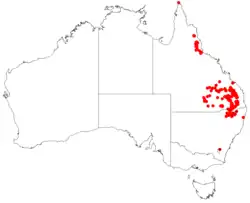 Allocasuarina inophloia grows in woodland on sandstone, ironstone or laterite ridges. It is found from near Herberton in Queensland to Torrington and Emmaville in New South Wales with a disjunct population in the Clarence River valley. In the Torrington area, it sometimes occurs in tall shrubland associated with species such as Allocasuarina brachystachya, Acacia williamsiana, Micromyrtus grandis and understorey shrubs, such as Leucopogon neoanglicus and Calytrix tetragona.[2][3][10]