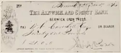 Alnwick and County Bank cheque, from the Berwick upon Tweed branch