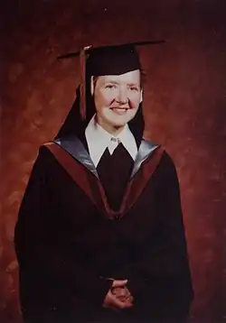 Sister Aloysius McVeigh wearing her MFA graduation robes, 1980.