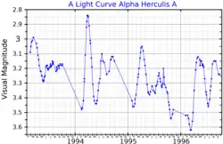 The primary has been specified as a standard star for the spectral class M5 Ib-II.[3] Like most type M stars near the end of their lives, Alpha Herculis is experiencing a high degree of stellar mass loss creating a sparse, gaseous envelope that extends at least 930 AU.[20] It is a semiregular variable with complex changes in brightness with periods ranging from a few weeks to many years. The most noticeable variations occur at timescales of 80–140 days and at 1,000 - 3,000 days. The strongest detectable period is 128 days.[21] The full range in brightness is from magnitude 2.7 to 4.0,[2] but it usually varies over a much smaller range of around 0.6 magnitudes.[21]