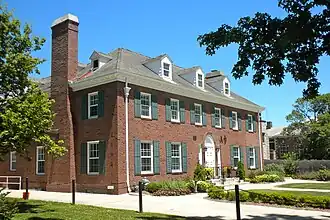 The two-story brick building has a five-bay exterior with a central entrance.[5] Its key Georgian details include raised brick quoins, pedimented dormers projecting from a gable roof, and large brick chimneys on either side of the house.[5][3] An addition was added to the house in 1950.[3]