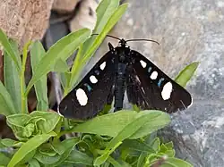 Otherwise, for identification, it is helpful to notice blue dashes between the white spots, the rounded wings, the broad thorax, and the fact that this a moth that flies during the day, not at night like most moths.[1]